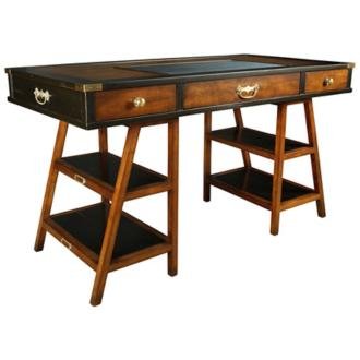 An important component of any World War I British officer's suite of campaign furniture was a serviceable desk. This clever design uses two trestles as both base for the top and shelving for books and accessories. Distressed finishes in black and brown. Distressed faux leather writing surface with solid brass knobs and carry handles mounted on sides of the three-drawer top section. Built to last a lifetime, entire unit is easy to break down for storage or transport. Wood construction. Distressed black and brown finishes. Brass hardware and leather accents. 55 1/4" wide. 31 3/4" deep. 28 3/4" high.