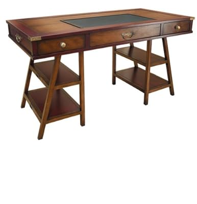 Reproduction of antique navy desk complete with drawers and brass bound. Desk has a faux-leather top, hand rubbed antique French finish and distressed red accents.