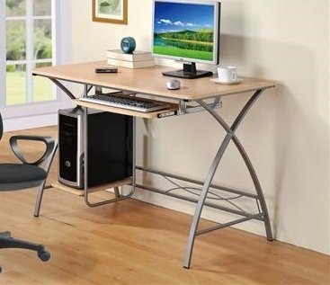 BuyDimension: Desk: 45"W x 24"D x 20"H . Natural and tan finish . Solid wood and metal construction . Has pull out storage on the desk for storing everyday needs or keyboard use . Has stand under drawer to put computer modem on .