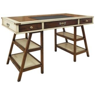 An important component of any World War I British officer's suite of campaign furniture was a serviceable desk. This clever design uses two trestles as both base for the top and shelving for books and accessories. Distressed French finishes in ivory and honey. Distressed faux leather writing surface with solid brass knobs and carry handles mounted on sides of the three-drawer top section. Built to last a lifetime, entire unit is easy to break down for storage or transport. Light assembly required. Wood construction. Distressed French woodgrain and ivory finishes. Brass hardware and leather accents. 55 1/4" wide. 31 3/4" deep. 28 3/4" high.