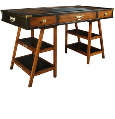 Reproduction of antique navy desk complete with drawers and brass bound. Desk has a faux-leather top, hand rubbed antique French finish and distressed black accents.